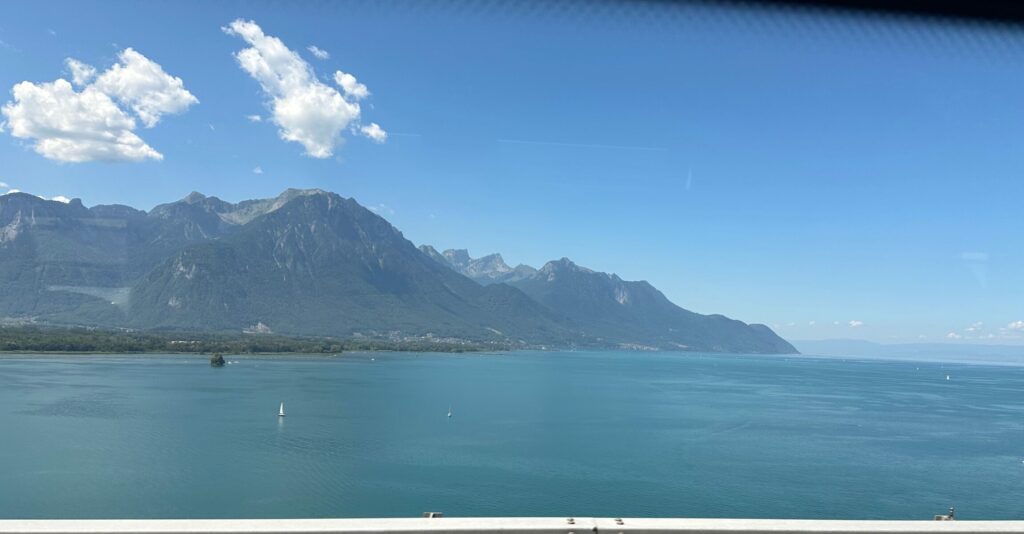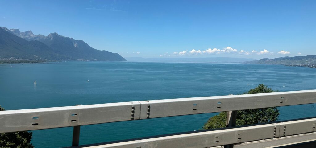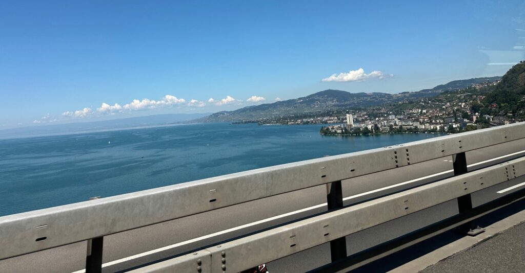Autostrada Torino Aosta. Buchiamo le Alpi attraverso il traforo del Gran San Bernardo, potendo ammirare la maestosità delle vette dai tornanti che Massimo dipinge al volante come un pittore fa con la sua tela. La prima volta per alcuni di noi. La ripida discesa interrotta solo dai lavoro in corso e quindi la possibilità di ammirare un panorama fatto di laghetti, torrenti e cascate fino alla prima sosta in terra elvetica. La Svizzera, il Cantone Francese. Le prime differenze con l’Italia sono evidenti!