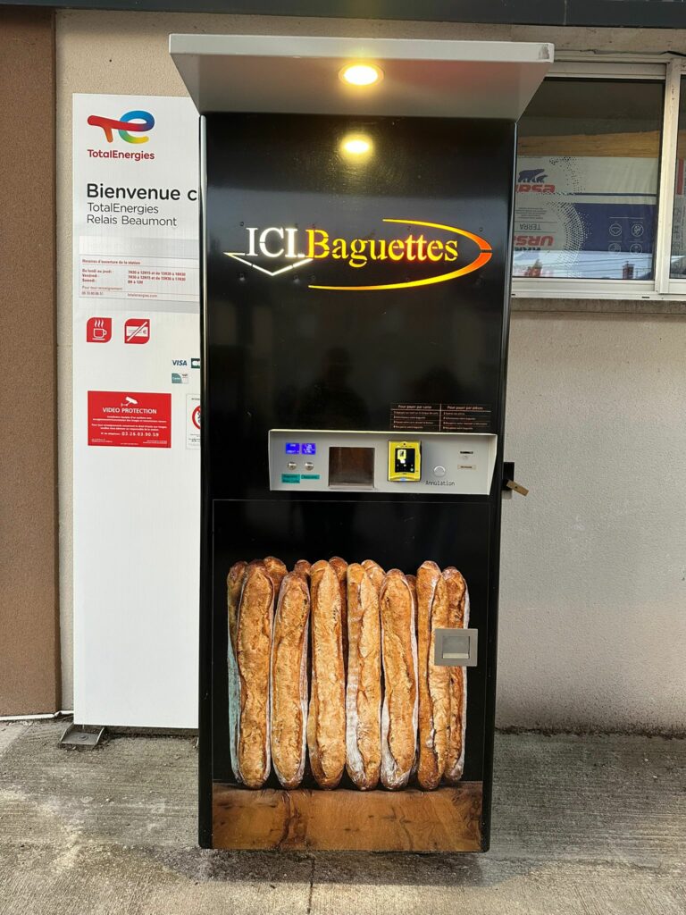 Eravamo ben cotti dal viaggio, ma avevamo un discreto appetito e allora siamo andati alla ricerca di un posto adatto alla bisogna. Il deserto totale intorno: solo campagna francese. Dopo qualche chilometro incontriamo una piccola frazione. Un rifornimento di benzina con un distributore di “baguettes“.
